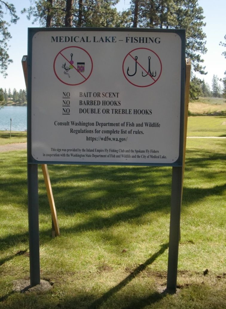 During a Zoom program presentation to our club Jolynn Beauchene, Washington Department of Fish and Wildlife Enforcement Officer mentioned the need for a sign at the Medical Lake City Park that spelled out fishing rules for Medical Lake. The sign would be placed at the park on the southwest end of the lake. She had come up with a sign concept that was more pictorial and thought it would be more effective.